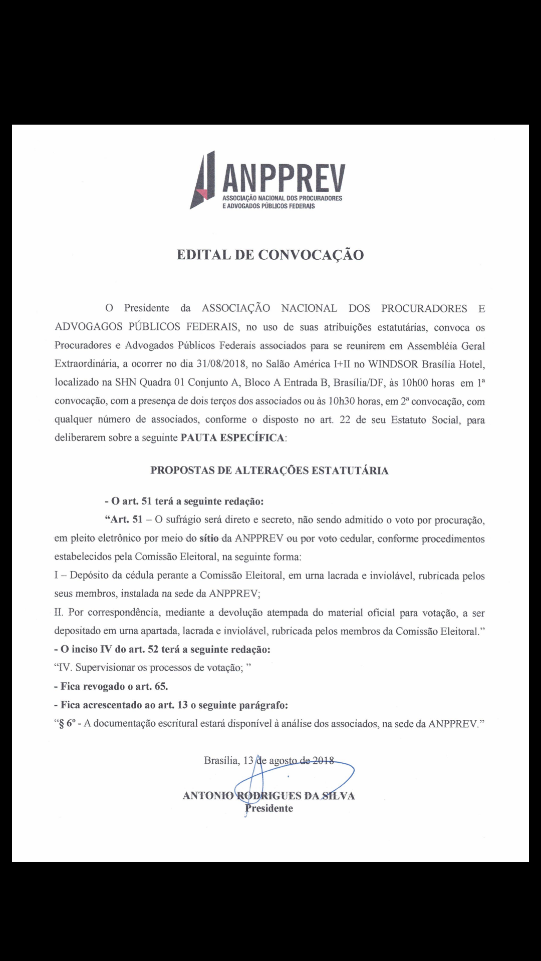 Conforme Edital abaixo, o Presidente da ANPPREV convoca Assembleia Extraordinária para tratar de alteração do Estatuto.