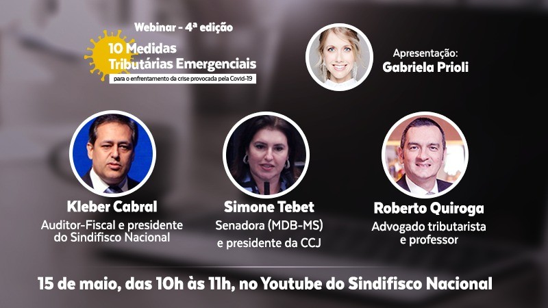 Os aspectos legais e políticos das 10 Medidas Tributárias Emergenciais para a superação da crise provocada pela pandemia da Covid-19 serão temas do quarto e último webinar da série promovida pelo Sindifisco Nacional. O debate virtual ocorrerá nesta sexta-feira, 15 de maio, com transmissão na página da entidade no Youtube, a partir das 10h.