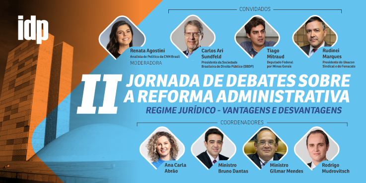 O presidente do Fórum Nacional Permanente de Carreiras Típicas de Estado (Fonacate), Rudinei Marques, participa nesta sexta-feira, 18 de setembro, da segunda edição da Jornada de Debates sobre a Reforma Administrativa, promovida pelo Instituto Brasiliense de Direito Público (IDP). O coordenador da Frente Parlamentar Mista da Reforma Administrativa, deputado Tiago Mitraud (NOVO/MG), e o presidente da Sociedade Brasileira de Direito Público, Carlos Ari Sunfeld, também participam do webinar, que será transmitido ao vivo pela página do IDP no Youtube, a partir das 10h.